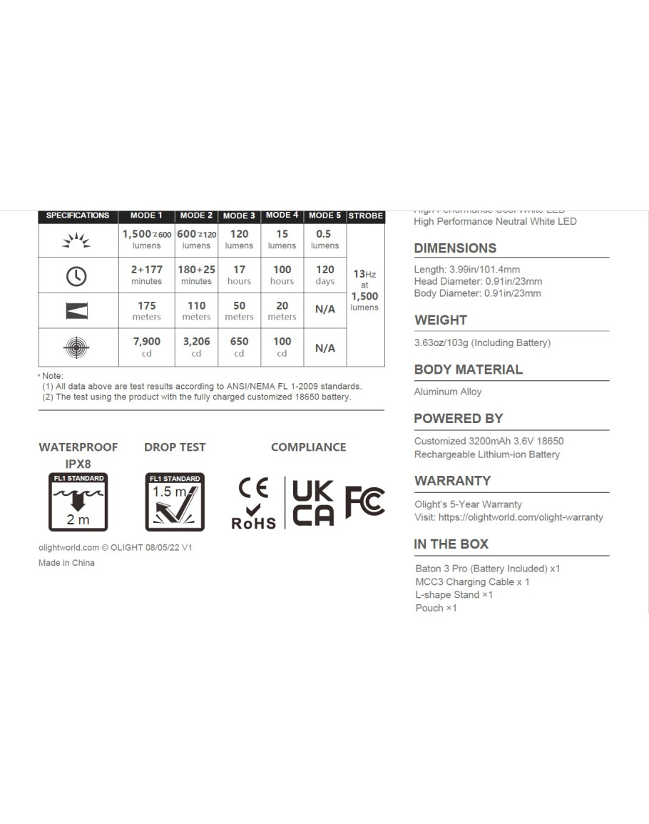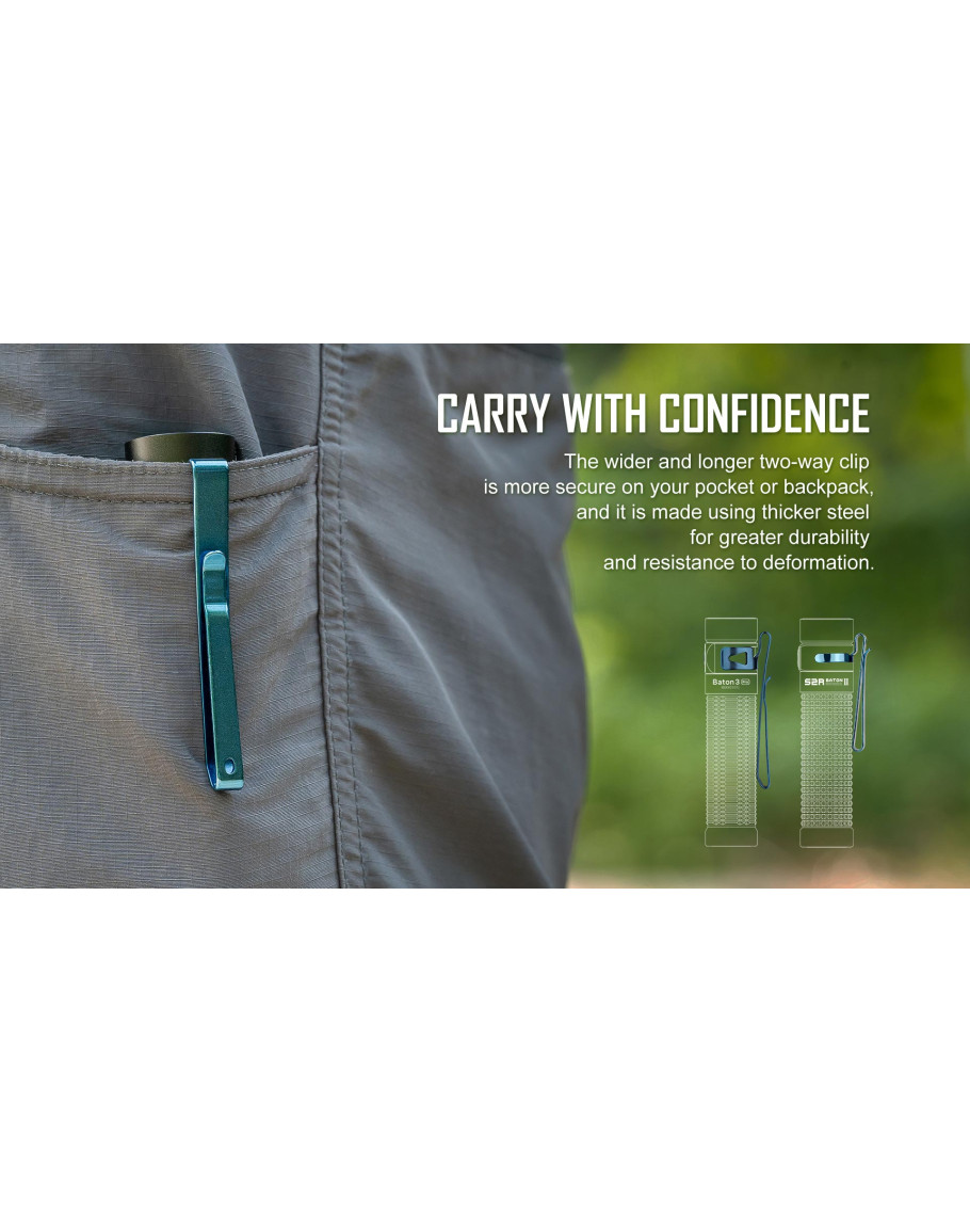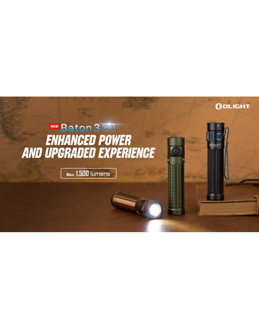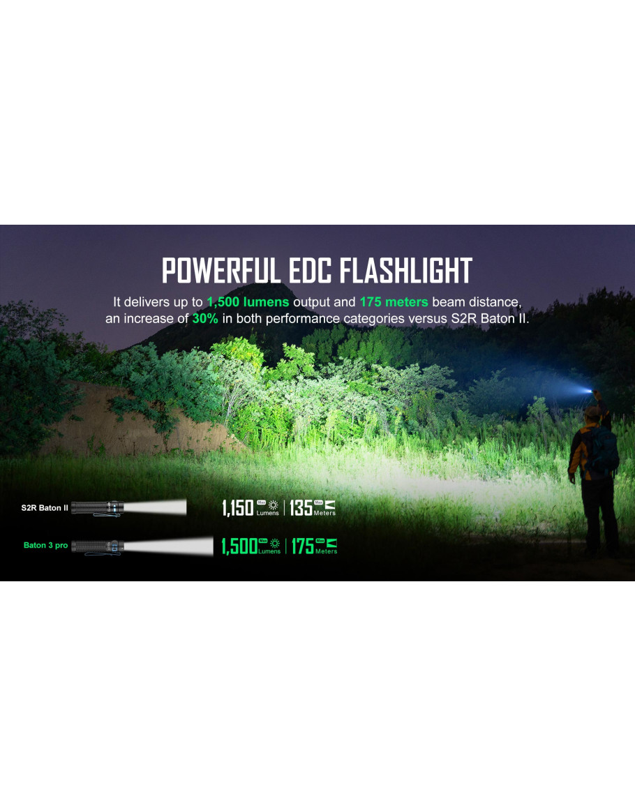 Baton 3 Pro е подобрената версия на S2R Baton II. Той е по-мощен с до 1500 лумена, увеличение от 30% спрямо S2R Baton II. С цветова температура, студено бяло, той отговаря на различни нужди и може да се справи при всякакви сценарии. Уголеменият вдлъбнат страничен превключвател го прави по-удобен и лесен за работа. Персонализираната акумулаторна литиево-йонна батерия 18650 3200mAh се зарежда напълно за 3,5 часа с помощта на USB магнитно зарядно. Можете да работите с Baton 3 Pro до невероятните 120 дни. Включената L-образна стойка се използва за съхранение на фенерчето удобно след употреба. Разширената и удължена двупосочна щипка е по-сигурна при закопчаване в джоба и раницата.