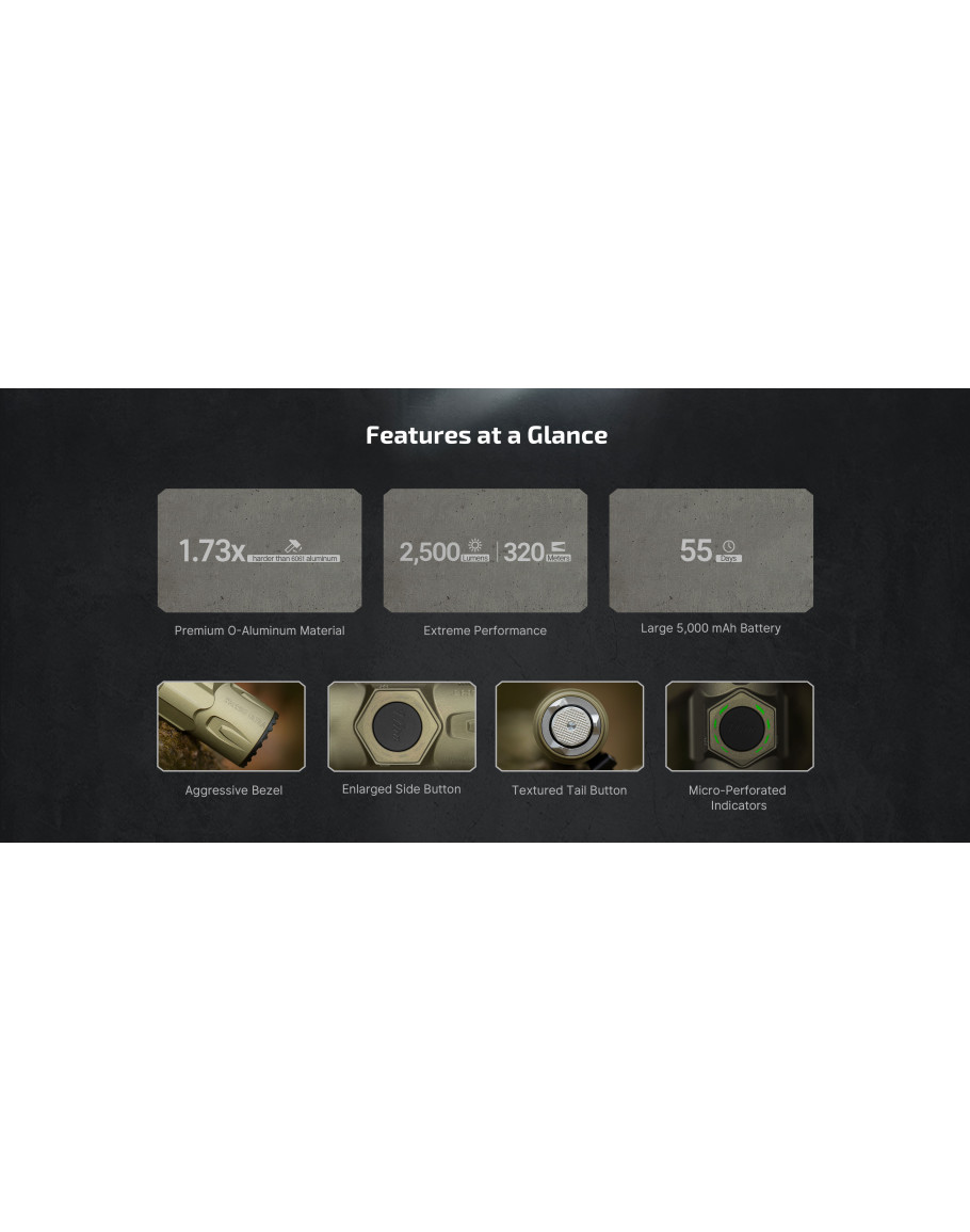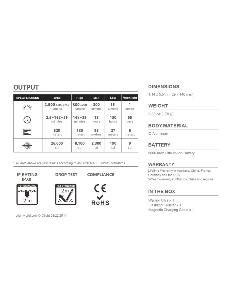Warrior Ultra е проектиран за превъзходна производителност и максимална надеждност. Изработен от висококачествена супер здрава O-алуминиева сплав, фенерът предлага изключителна здравина, устойчивост на износване и защита на вътрешните компоненти. Той комбинира мощна светлина от 2500 лумена и 26 000 кандела в Turbo режим, осветявайки разстояния до 320 метра – идеален избор за тактически мисии, патрули, лов и приключения на открито.